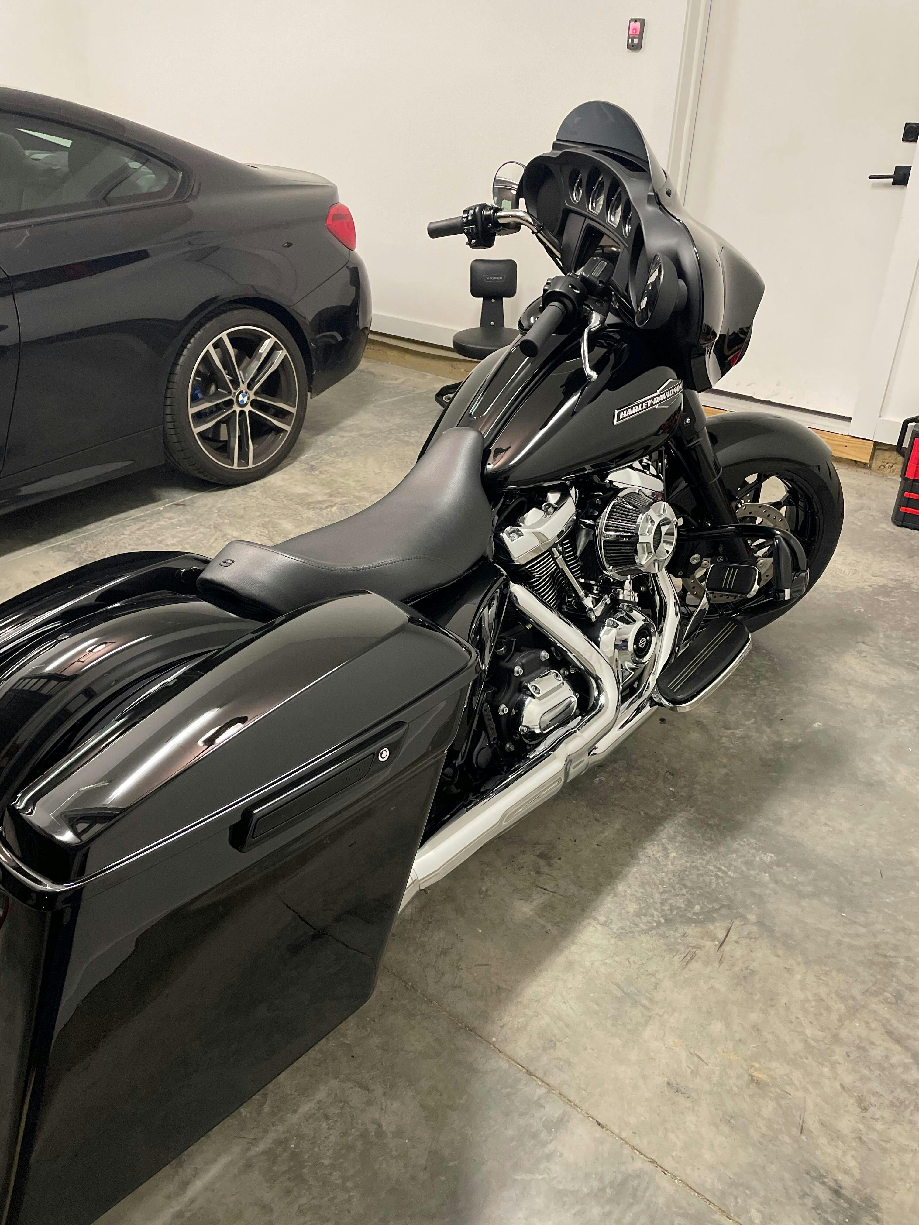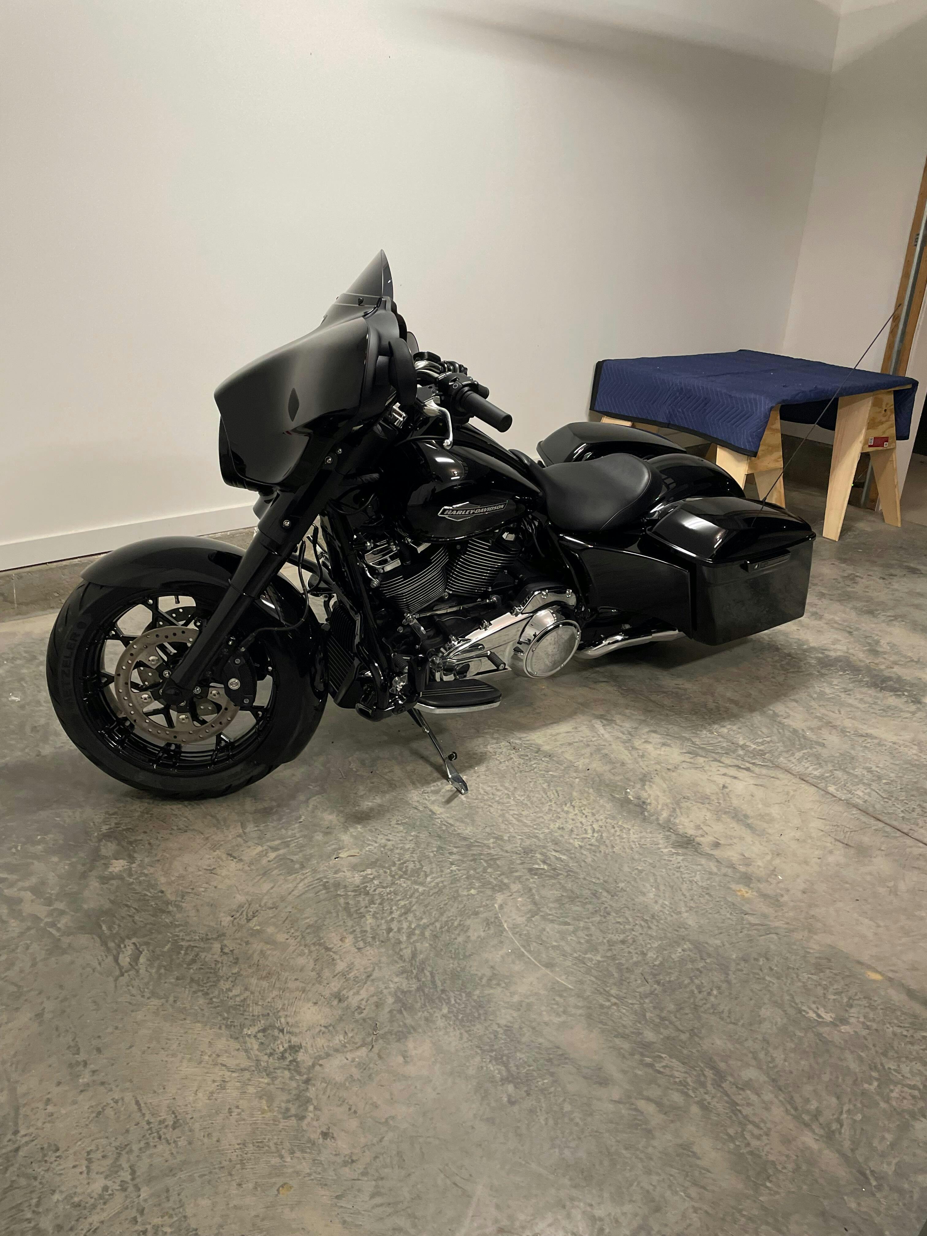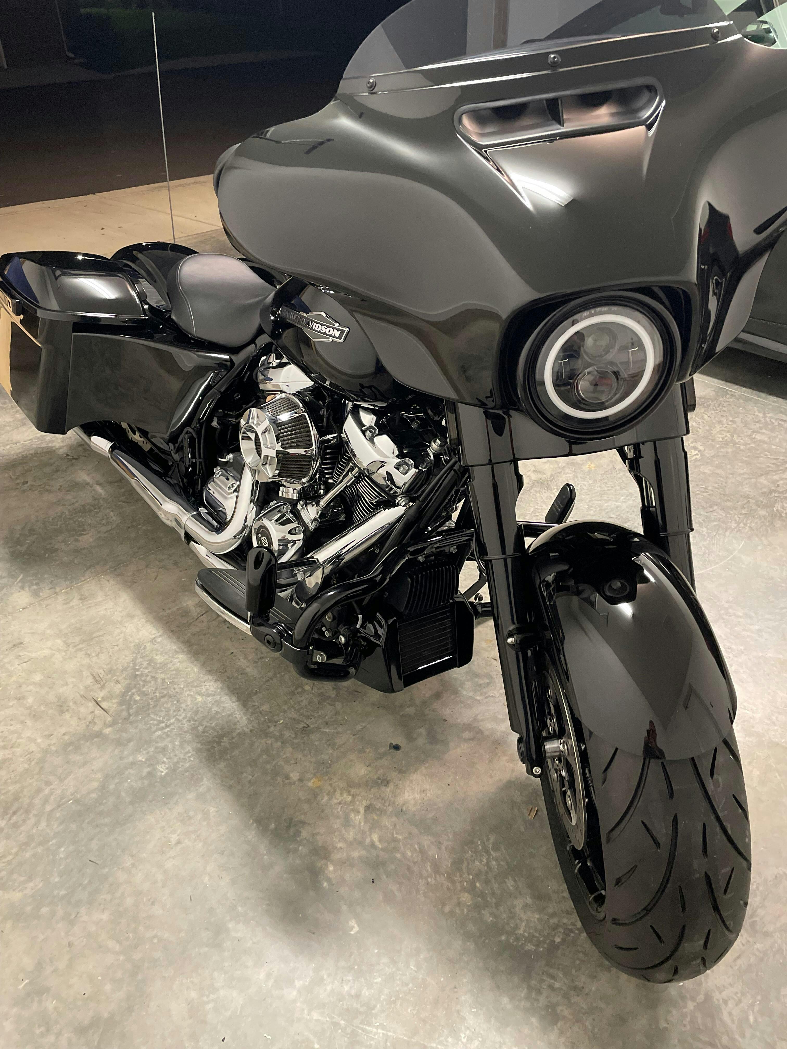You are looking at our new 180mm EZ RUSH Pitbull front tire kit for 2014-present HD Touring models. This new kit DOES NOT REQUIRE A FORK LEG CHANGE!! We put a small step bend in the fender tab to step inboard so our fender will fit the stock dimension fender mount. Pricing for this kit starts at $649.95 for a raw metal finish on the CNC cut aluminum slider covers. Black or chrome slider covers are available for extra cost. Please see menus below for pricing details.